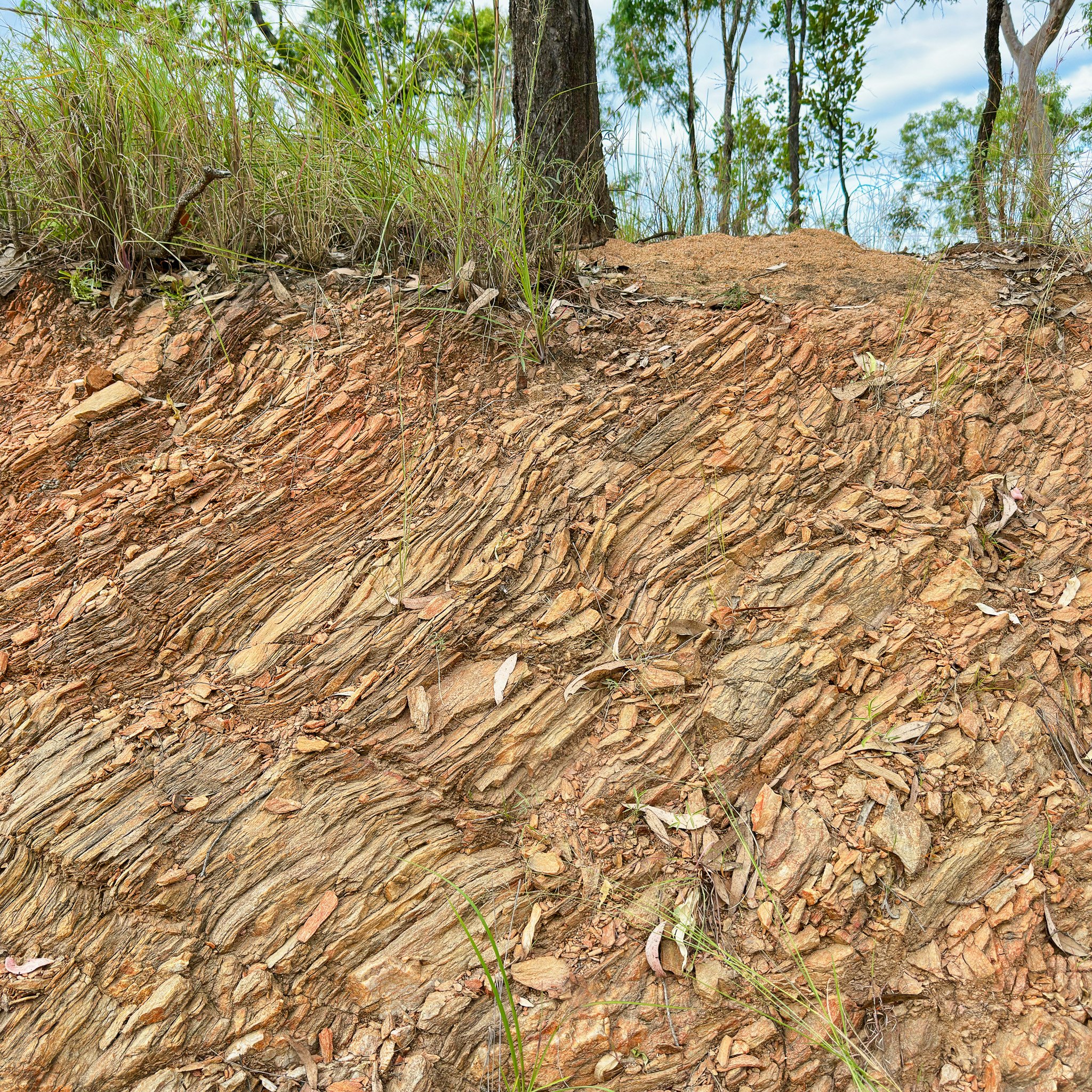 Powerful compressional forces deformed the Hodgkinson Formation sediments — folding, faulting and metamorphosing them into the schist visible today at the road cutting. This inscribed the first major fracture network into the rocks of the area — the regional joint sets that would subsequently control everything that followed. The dominant joint orientations on the creek bed slabs likely originate here.