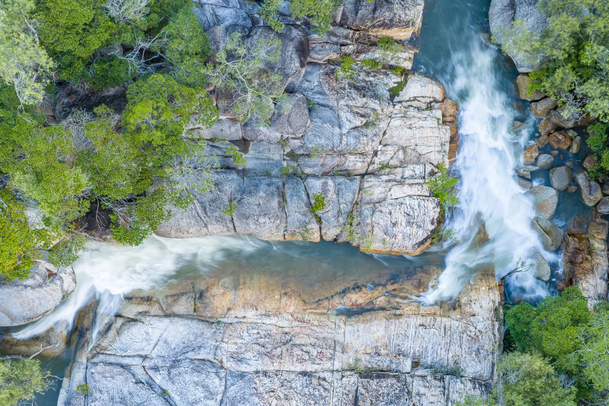 As millions of years of erosion stripped the overlying rock, pressure on the granite below was progressively released. The granite expanded upward and developed sheeting joints broadly parallel to the surface and to the original dome geometry of the intrusion — producing the broad flat slab surfaces visible upstream of the falls.